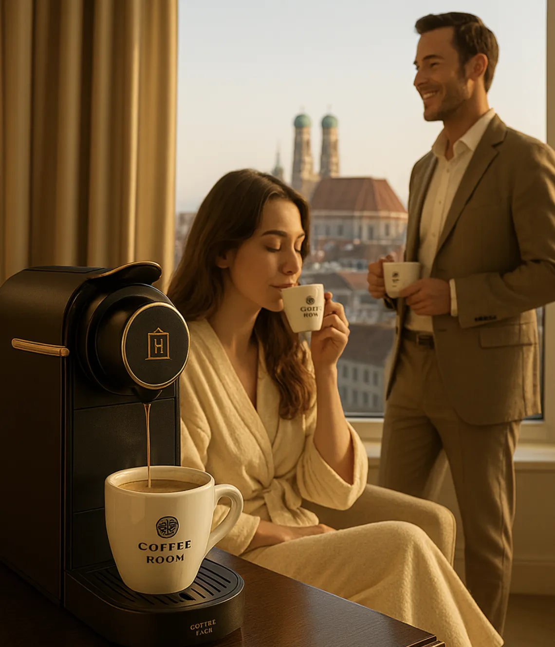 Werden Sie ein CoffeeRoom Hotel und bieten Sie Ihren Gästen ein wahres Sinneserlebnis mit Triple-Class-AAA-Kaffee direkt im Zimmer.